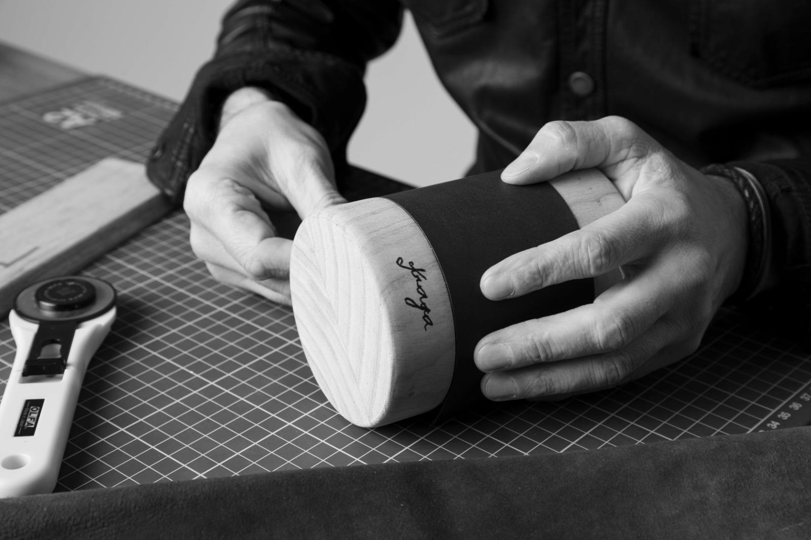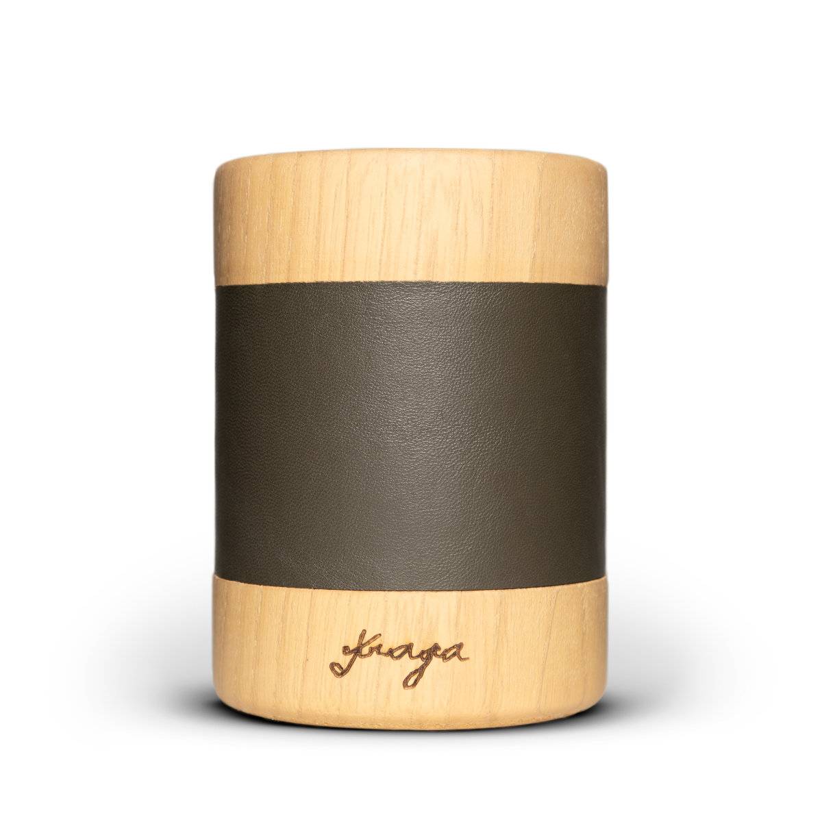 Vela artesanal premium que combina madera de castaño natural con piel de cordero café, pieza de lujo de artesanía gallega.