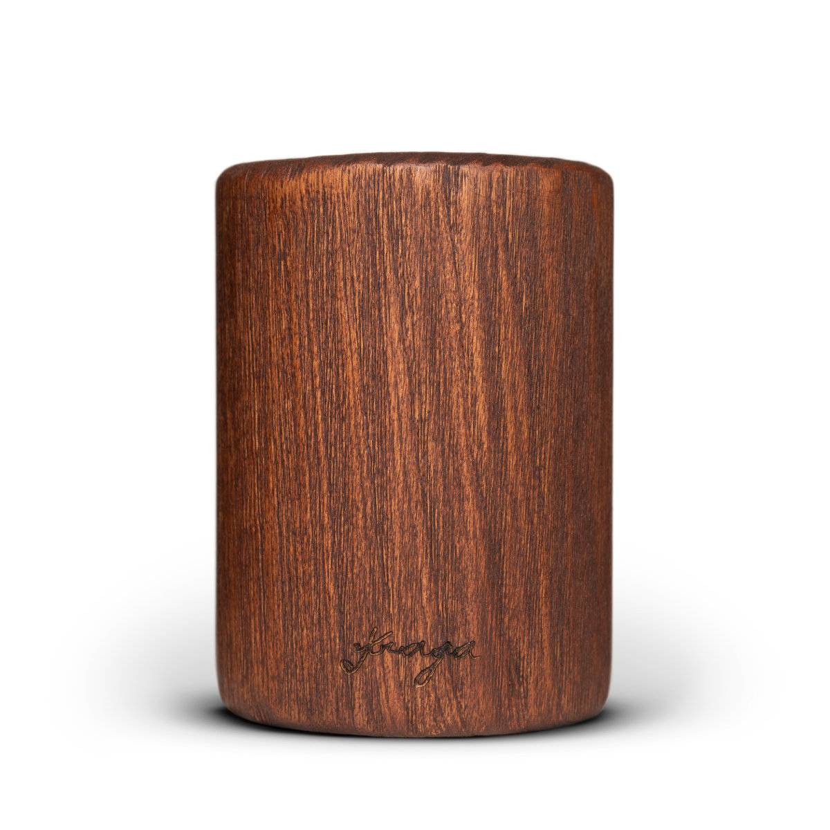 Vela artesanal de madera maciza con acabado rústico café oscuro, elaborada con 25 años de experiencia en maderas nobles gallegas.